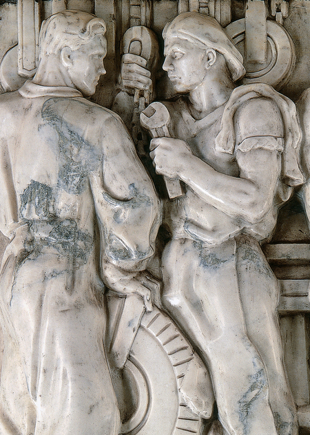 Горельефы-метопы из прохоро-баландинского мрамора, расположенные по обе стороны перонного зала, были заказаны Георгию Ивановичу Мотовилову. Маститый скульптор изобразил на них строителей танков, собирающих грозные машины; литейщиков, снабжающих фронт и тыл металлом; автостроителей и текстильщиков; нефтяников и путейцев. Два горельефа посвящены труженикам колхозных полей, на трех изображены «Электрозавод», его люди и продукция.
