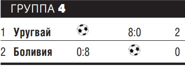В четвертой группе оказалось сразу двое «отказников», поэтому все свелось к единственному матчу. Уругвай разгромил Боливию со счетом 8:0, при этом лучший бомбардир «селесте» Оскар Мигес отметился хет-триком. Абсурдность ситуации высмеяли журналисты, подсчитавшие, что очень слабые боливийцы внезапно стали восьмой командой мира.