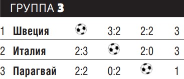 В первом же матче группы 3 встретились фавориты — Италия и Швеция. Шведы приехали в Бразилию в ранге победителей Олимпиады, итальянцы — действующими чемпионами мира. Однако составы обеих команд были далеки от сильнейших. Лучшие игроки шведов после победы на Олимпийских играх в Лондоне перешли в профессиональные европейские клубы и, согласно существовавшим в то время правилам, утратили возможность играть за сборную. В свою очередь, итальянцы еще не оправились от последствий катастрофы самолета с клубом «Торино». Не желая лишний раз рисковать, «скуадра адзурра» отправилась в Рио-де-Жанейро на теплоходе «Изес» из Неаполя. Долгое плавание помешало игрокам как следует подготовиться к турниру. Шведы нанесли итальянцам первое поражение в чемпионатах мира, при этом главными героями матча газеты единодушно признали вратаря Свенссона и 20-летнего инсайда Скоглунда. Голкипер шведов в середине первого тайма в блистательном броске не позволил итальянцам увеличить счет до 2:0, а Скоглунд стал непосредственным организатором всех трех шведских голов. Вдобавок его дважды сбили в штрафной, но свисток арбитра промолчал.