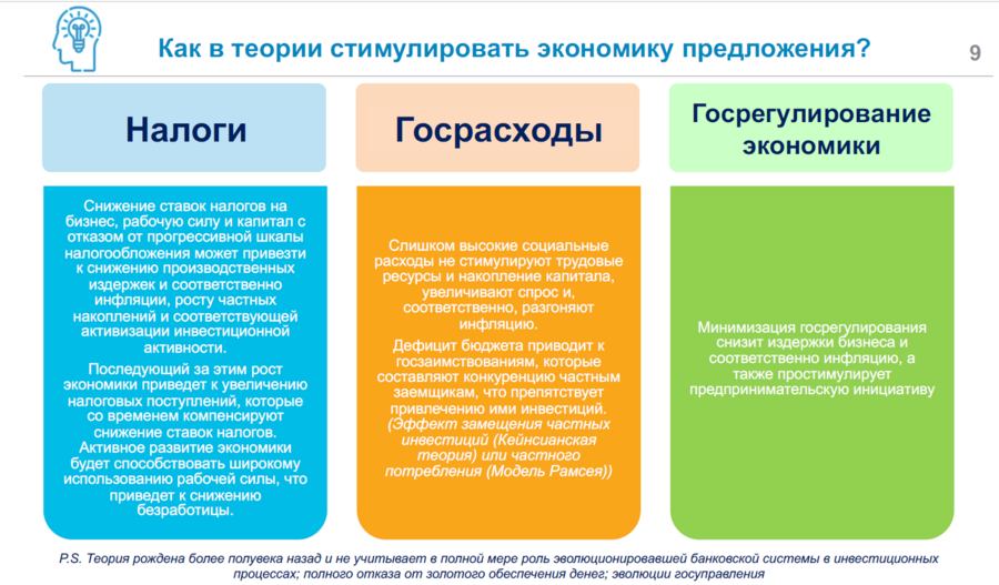 Основная цель экономики предложения заключается в сохранении низкой инфляции и удержании экономического роста с помощью наращивания предложения, которое должно быть именно в тех отраслях, которые пользуются спросом.