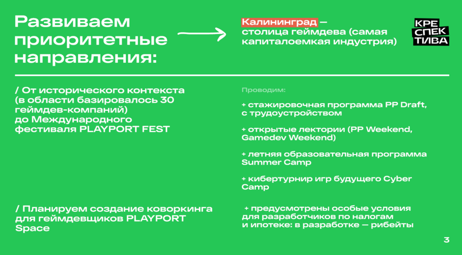 Особенно активно развивается индустрия геймдейва — много IT-компаний уже давно базируются в Калининграде. Флагманский проект фонда — большой международный фестиваль геймдева Playport, который в этом году прошел уже в 4 раз.