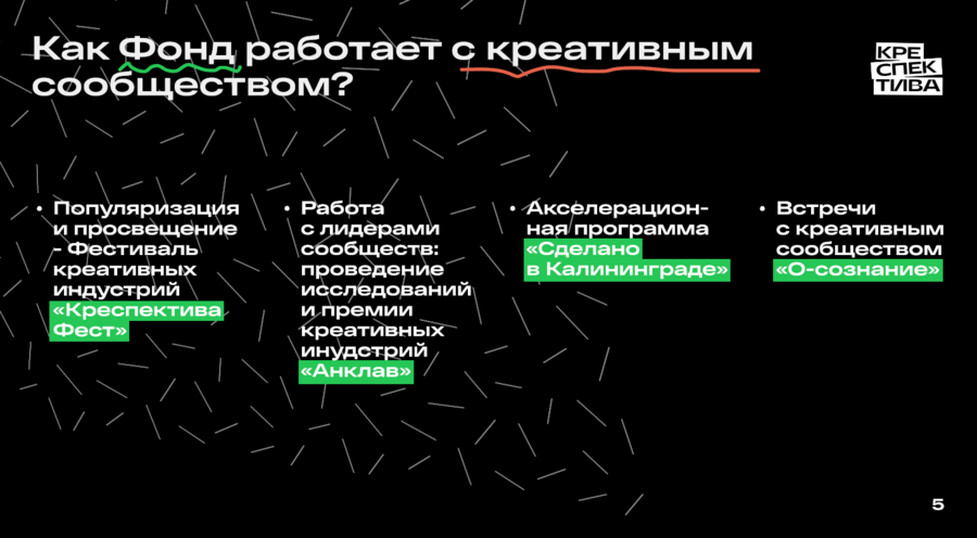 Креативный продюсер Фонда креативных индустрий Калининградской области «Креспектива» Екатерина Мирошникова рассказала, что фонд как опорная организация по распоряжению правительства Калининградской области и работает с 2020 года.