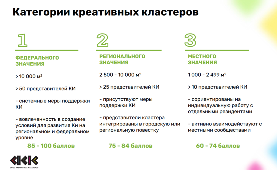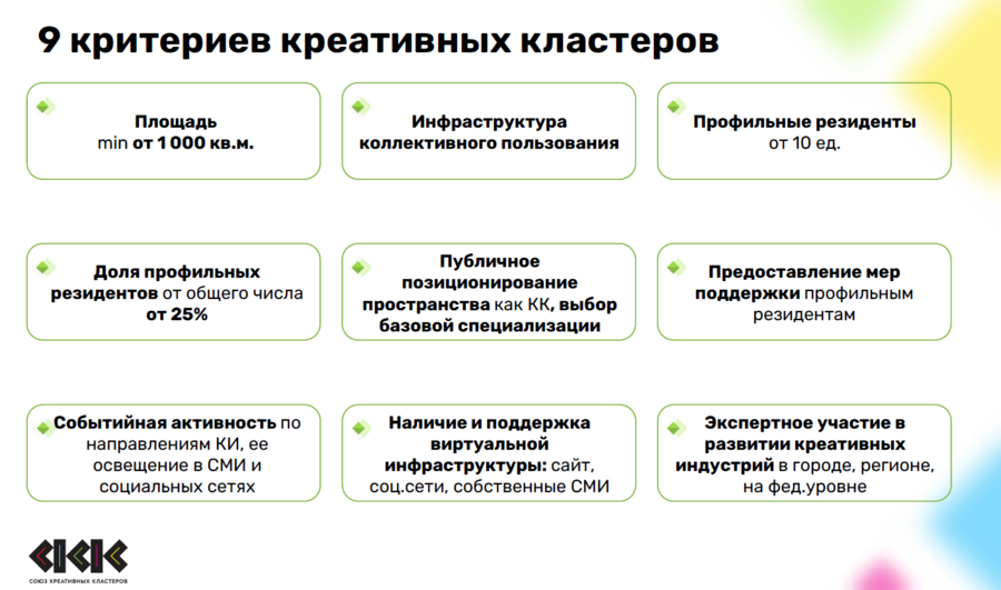 В ходе исследования Союз анализировал кластеры по следующим составляющим: финансовые показатели, площадь объектов, специфика резидентной политики, данные о численности и составе резидентов, соцсети и сайты. В результата Союз выявил 9 критериев креативных кластеров.