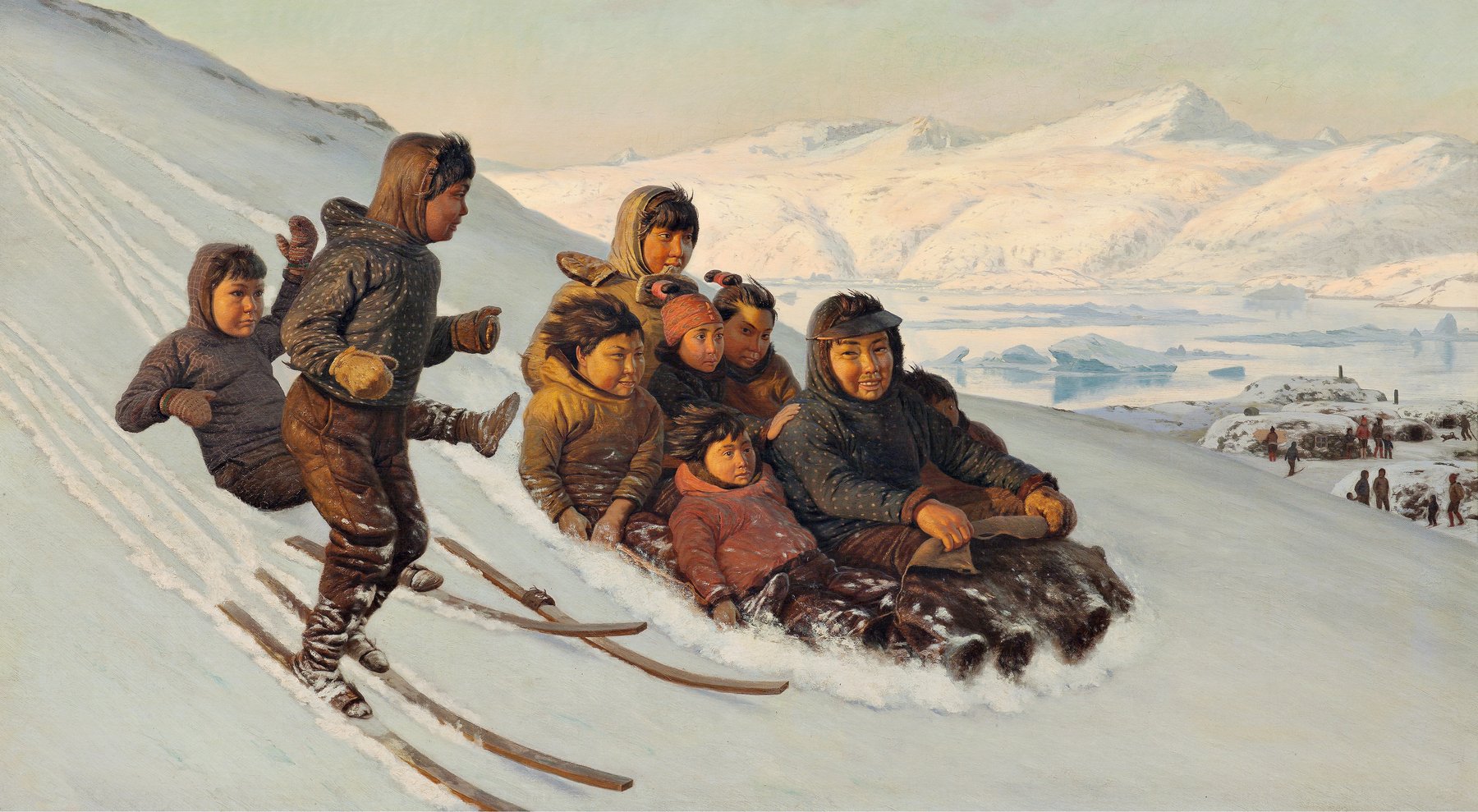 Датчанин Карл Расмуссен был одним из первых художников, посетивших Гренландию. Вместо того, чтобы совершенствовать мастерство в Италии, как это делали большинство его коллег, он в 1870 году отправился на холодный остров. Расмуссен изображал арктические ландшафты и жизнь местного населения, его обычаи и нехитрые развлечения — такие как спуск с горы на лыжах и санях. Его работы были хорошо приняты, и одну из картин купил Государственный музей искусств в Копенгагене. Через 20 с лишним лет Расмуссен совершил еще одну поездку в Гренландию, но не успел ее запечатлеть, упав за борт и утонув на обратном пути.