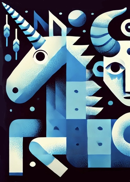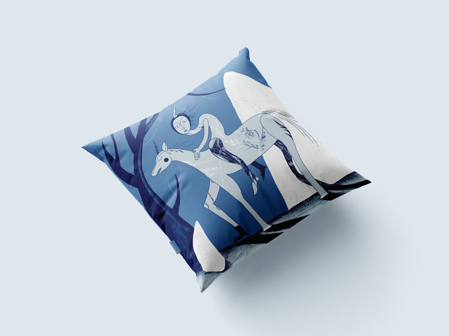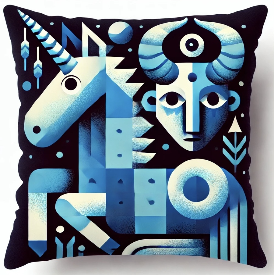 Prompt: a pillow with a strange horned horse and a horned man on it in simple illustrative stile