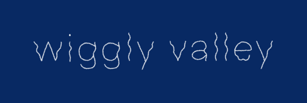 Prompt: simple vector illustration in blue colours with mystical creatures and whimsical sign «Wiggly valley»