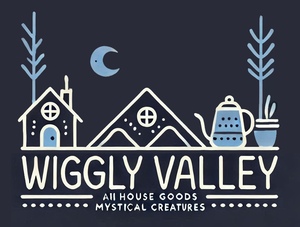 Prompt: an advertising poster «wiggly valley» for advertising household goods shop with a simple illustration of a mystical horned creature