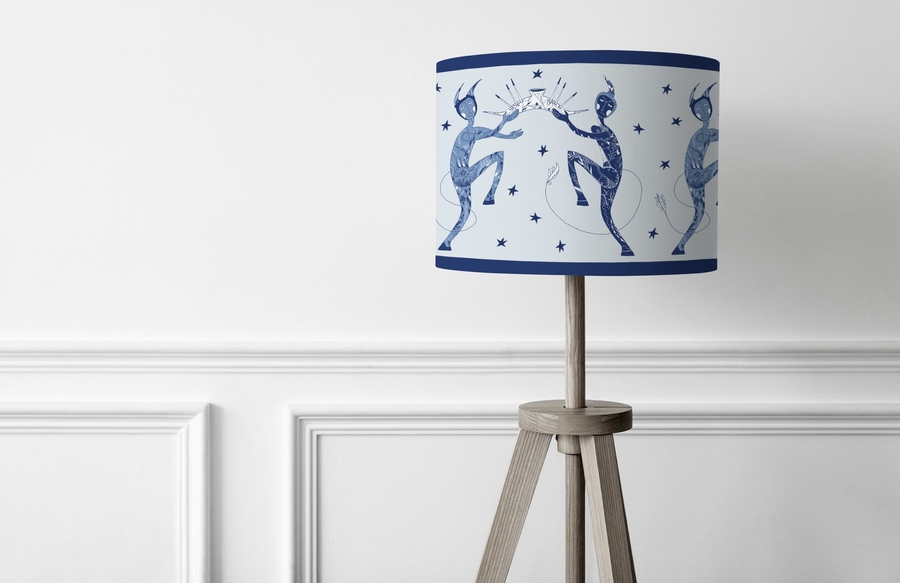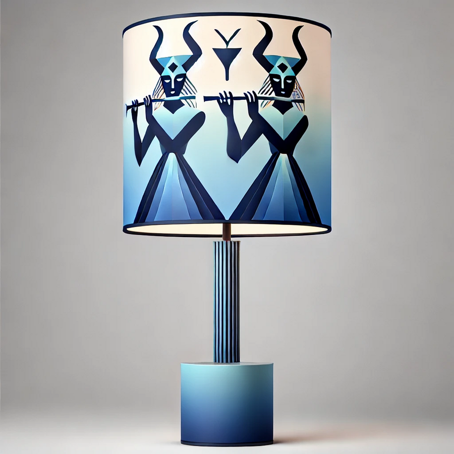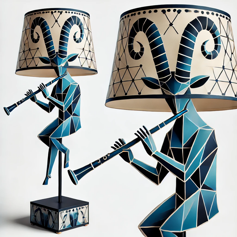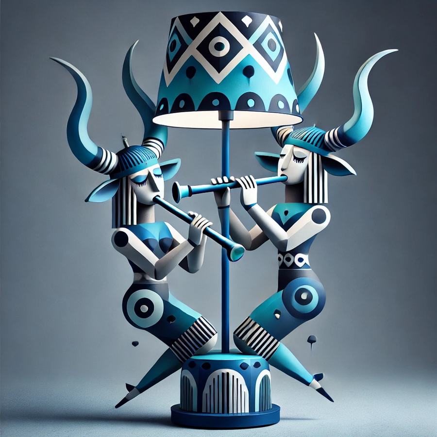 Prompt: blue floor lamp with 2 horned people playing flute in geometric illustrative art style