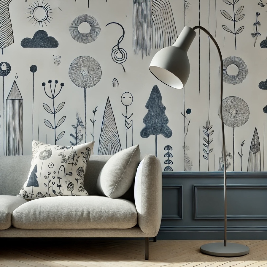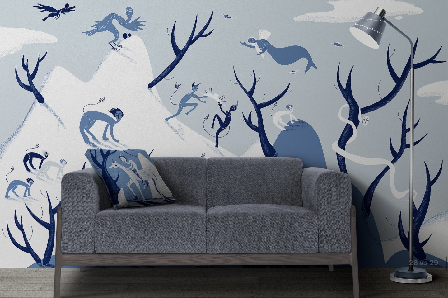 Prompt: a cosy room with a sofa and a pillow on it and a lamp with simple illustrative wallpaper featuring magical valley use shades of blue only