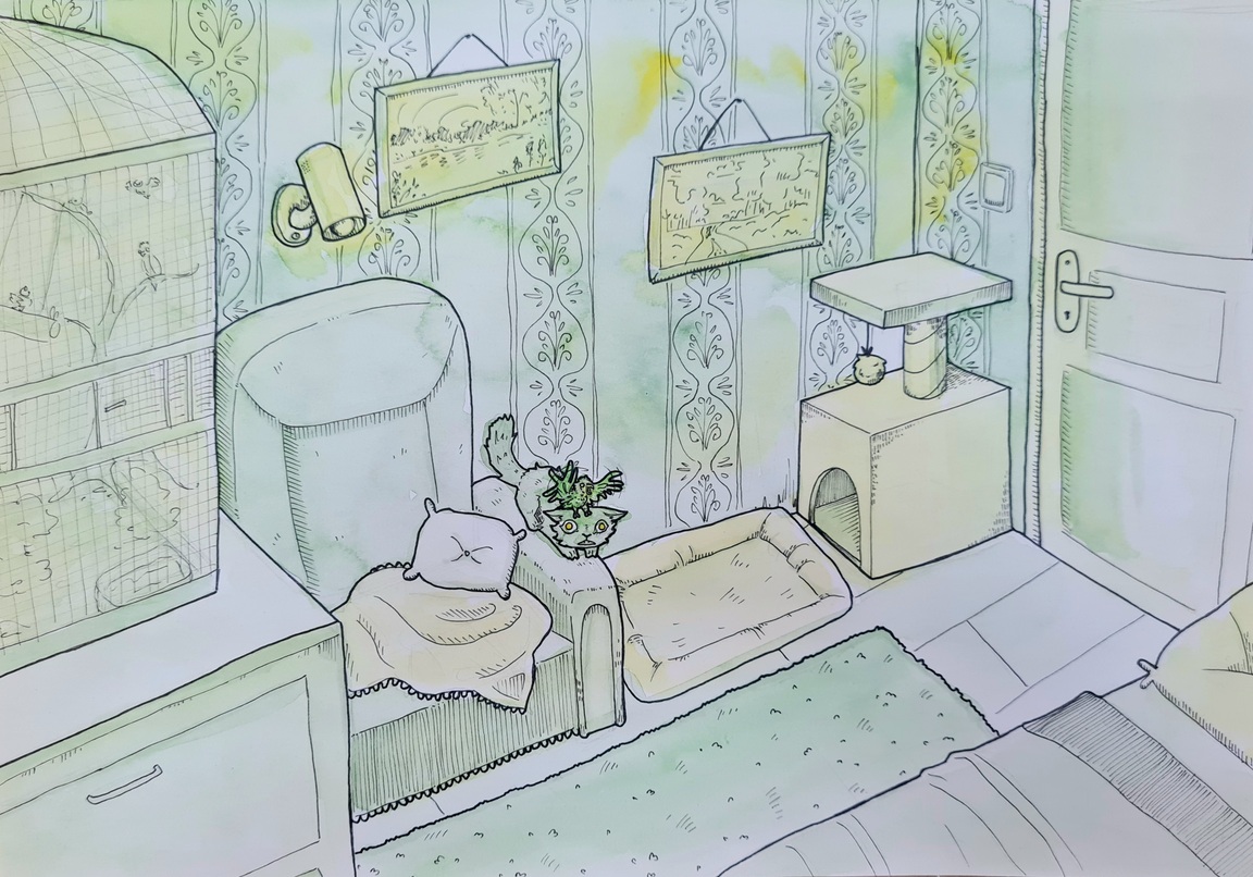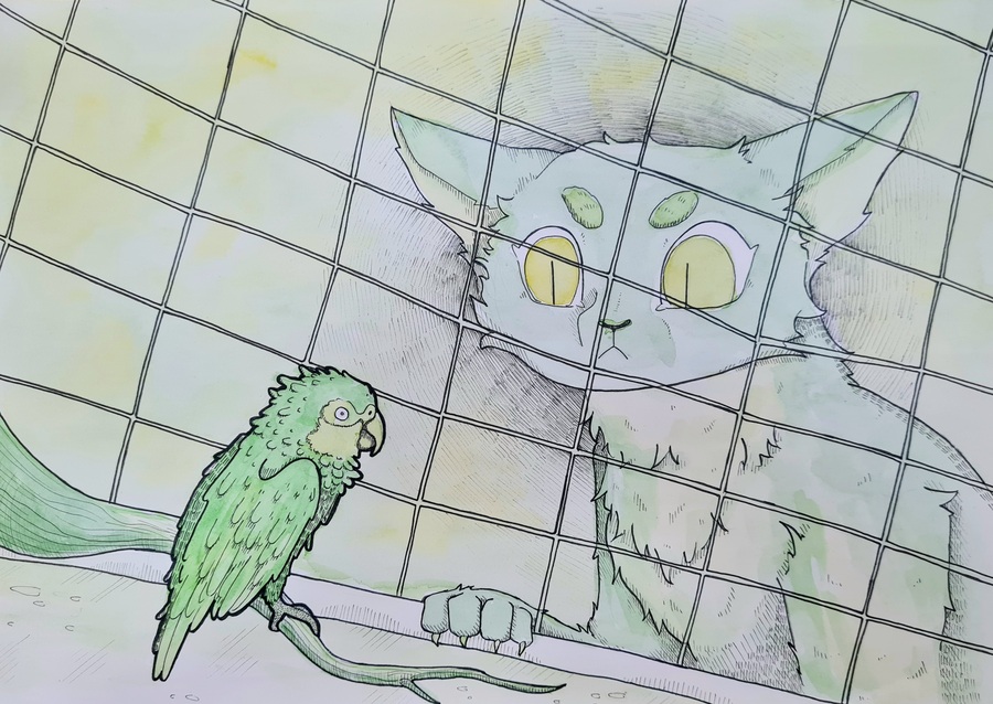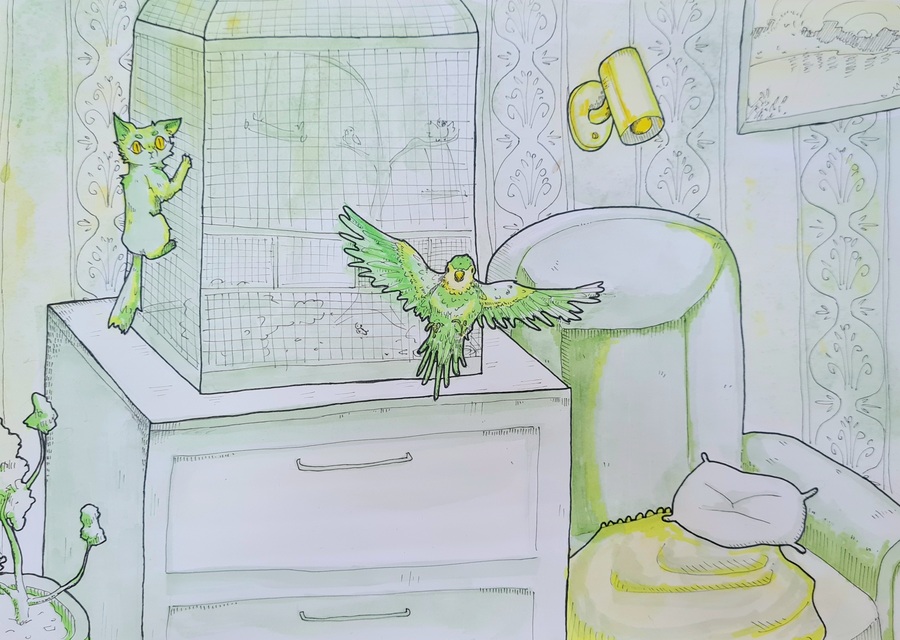 Описание: это иллюстрации по рассказу «Вот так птица попугай!». На трех изображениях представлены некоторые ключевые сцены из рассказа. Работа выполнена красками (акварелью), линерами и маркерами.