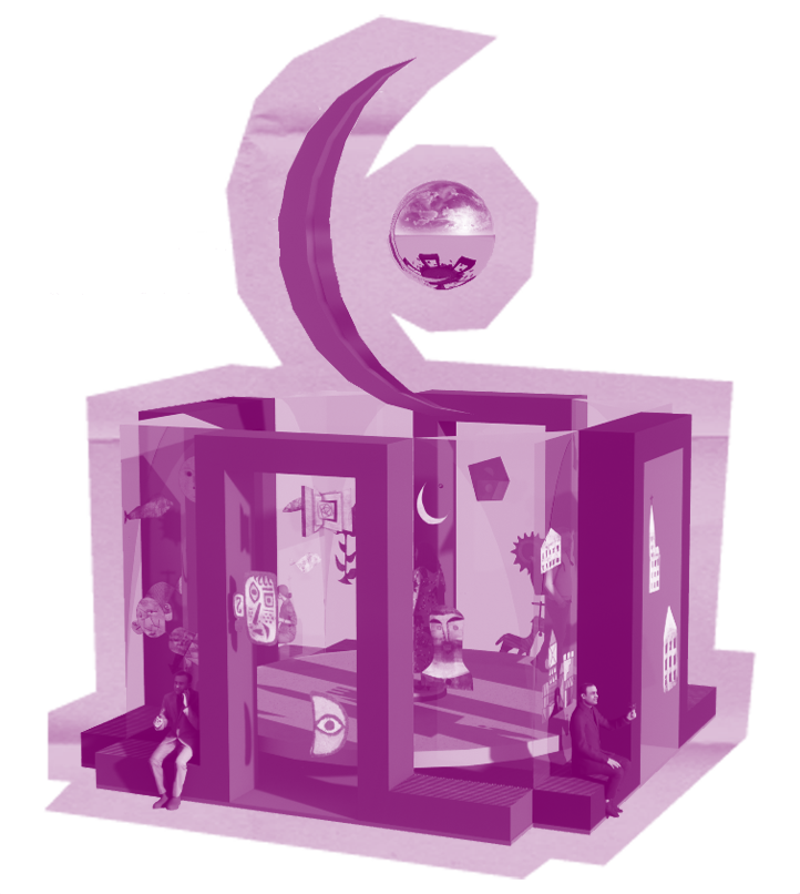 Коллажи справа всегда состоят из 3 частей и 3 цветов, отсылающих на концепцию и цветовое решение каждой главы.