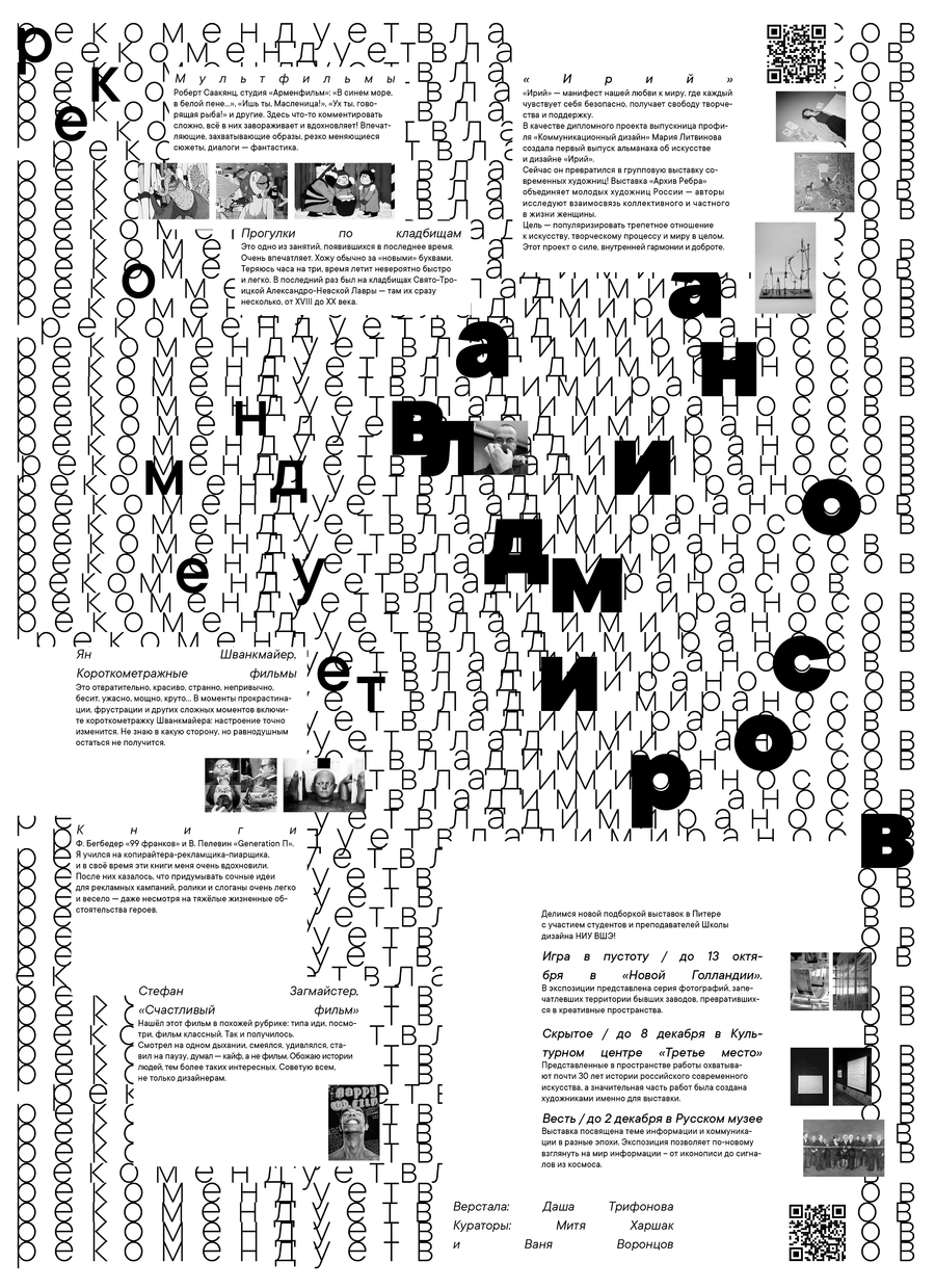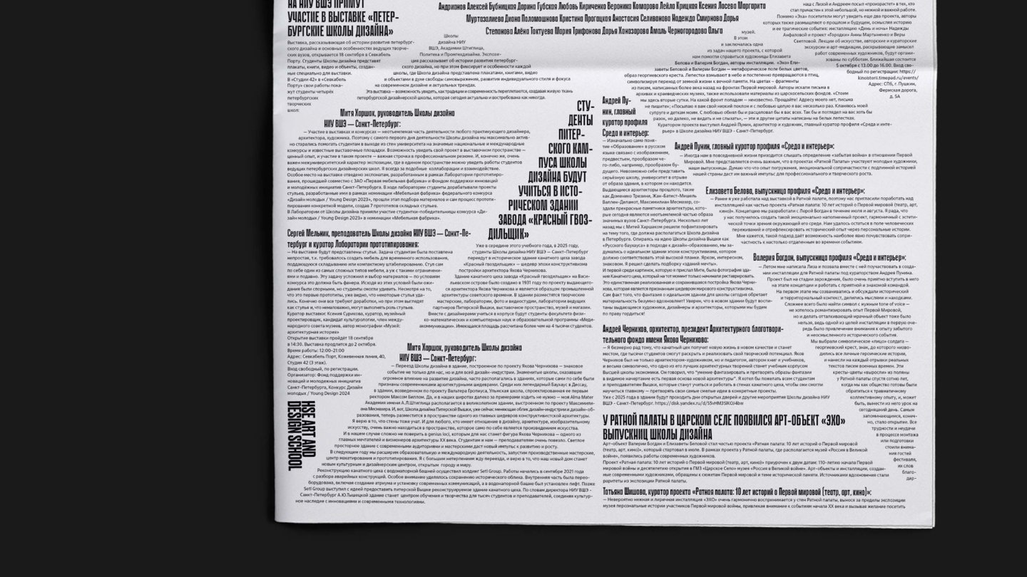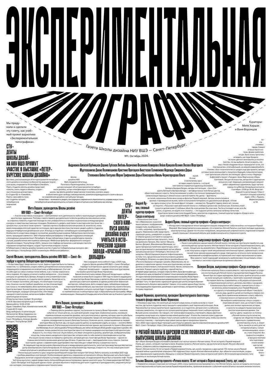 В этом модуле мы создали комплекс типографических клаузур: портрет, натюрморт, пейзаж, выполненных в техниках аппликации и цифрового коллажа. Помимо этого, мы пробовали себя в экспериментальном леттеринге, а также выполнили дизайн газетных полос формата 420×578 мм по текстам новостей Школы дизайна.