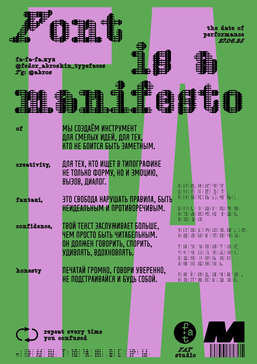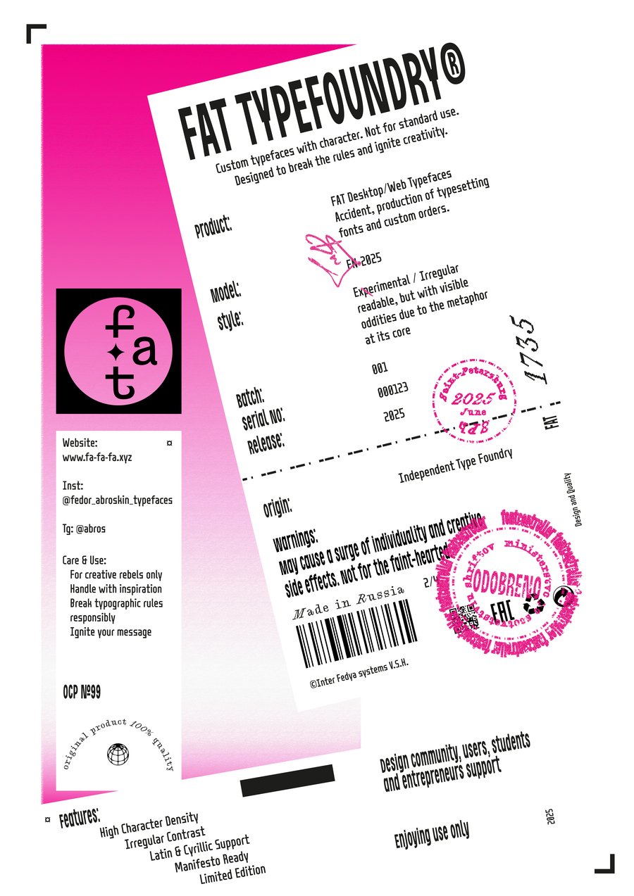 Fedor Abroskin Typefaces (FAT) — независимая тайпфаундри, специализирующаяся на работе с акциденцией, производстве наборных шрифтов и кастомных заказах.