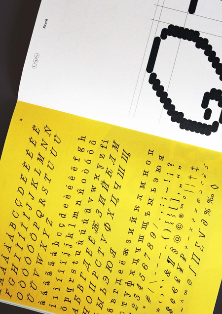 Спесимен содержит 4 раздела, каждый — про конкретный шрифт. Раздел содержит в себе: весь набор глифов, крупномасштабные буквы, наборный текст на латинице и кириллице, особенности шрифта, набор белым по черному и примеры использования на носителях.