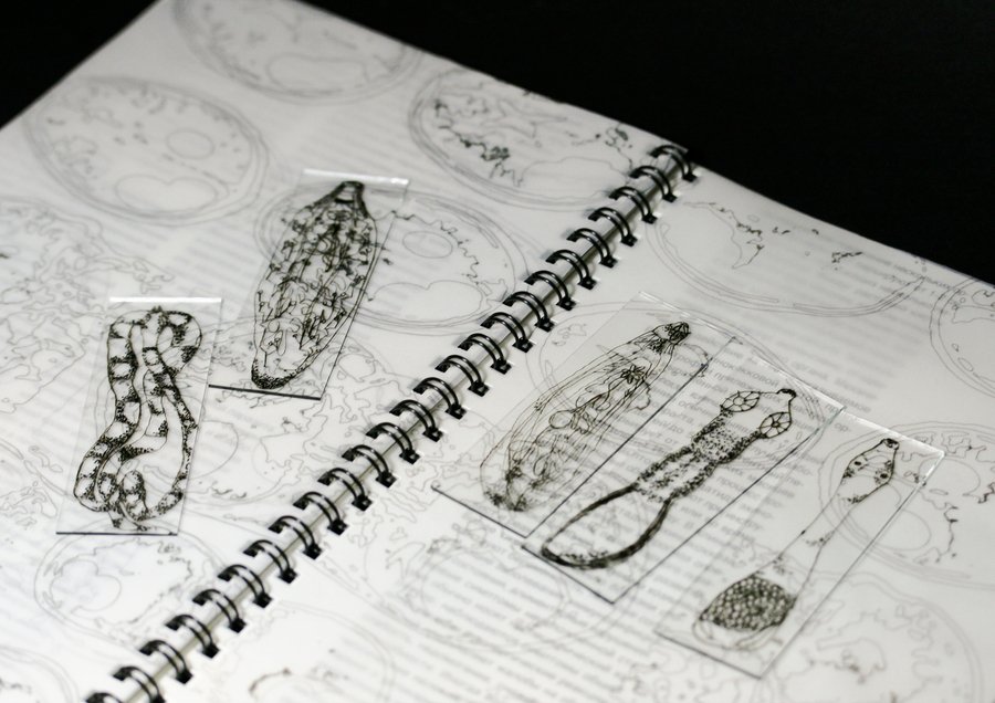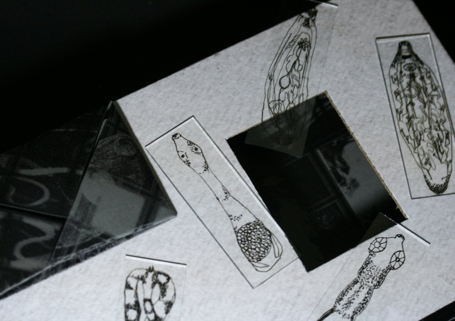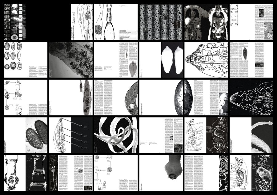 «Медицинская паразитология: Плоские черви» — компактный справочник, посвящённый паразитическим плоским червям, созданный под вдохновением от старых медицинских и биологических учебников. В рамках работы я переосмыслила дизайн таких изданий, сделав его смелее. Помимо самой книги, проект включает чехол для неё и конверт с иллюстрациями плоских червей на предметных стеклах.