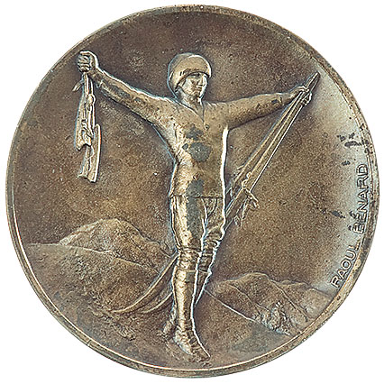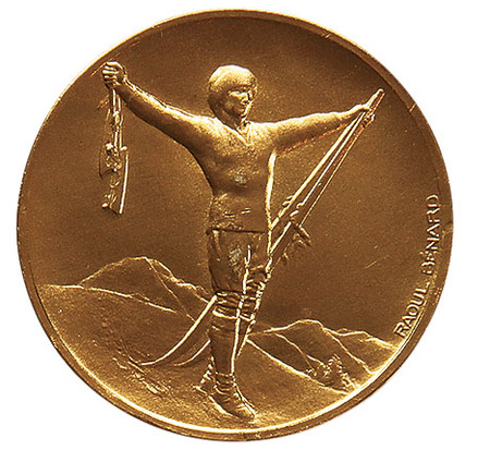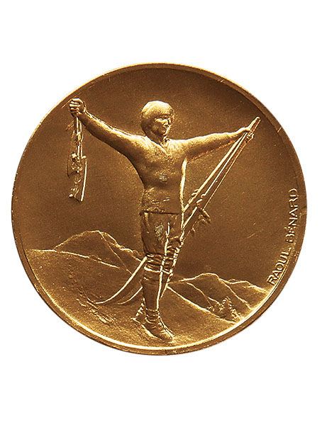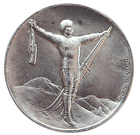 Аверс: на фоне альпийского пейзажа с Монбланом — фигура спортсмена в зимней экипировке с коньками и лыжами в распростертых руках. Справа по-французски имя и фамилия художника: Raoul Benard.