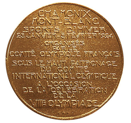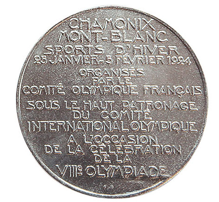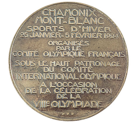 Реверс: по всему полю медали текст в 14 строк по-французски: CHAMONIX MONT-BLANC SPORTS D’HIVER 25 JANVIER-5 FEVRIER 1924 ORGANISES PAR LE COMITÉ OLYMPIQUE FRANÇAIS SOUS LE HAUT PATRONAGE DU COMITE INTERNATIONAL OLYMPIQUE A L’OCCASION DE LA CELEBRATION DE LA VIIIe OLYMPIADE (Шамони Монблан зимние Игры 25 января — 5 февраля 1924 организованы под высочайшим патронатом Французского олимпийского комитета при поддержке Международного Олимпийского комитета по случаю празднования VIII Олимпиады).
