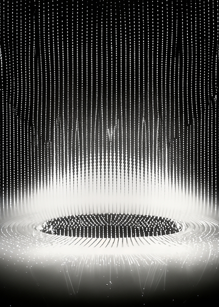 ПРОМТ: Принт из белых светящихся точек. Добавить линии между точками. Добавить чёрно-белый фильтр. Добавить эффект дымки в центре. Убрать градиентные переходы. Добавить эффект шума. Добавить контрастность цвету. Увеличить экспозицию цвета. Добавить эффект сжатия картинки к центру. Добавить эффект негатив.