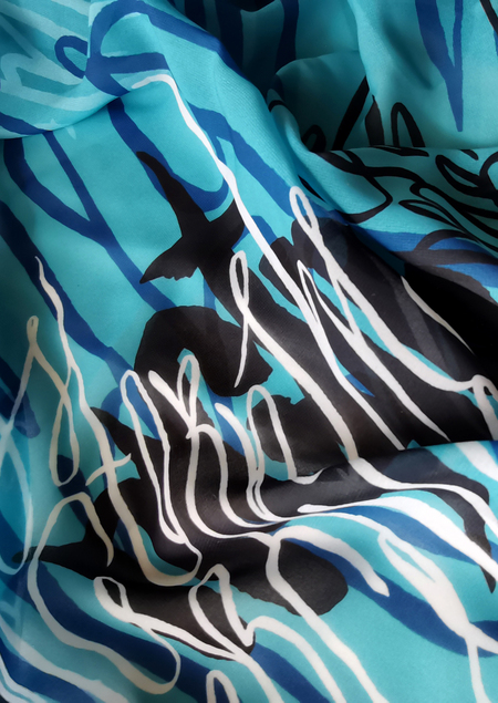 Выбранным мною каллиграфическим объектом стало парео, потому что оно не только ассоциируется у меня с морем, но также его материал, а именно ткань, связан со словами песни: «Хвост — ее разорванное платье».