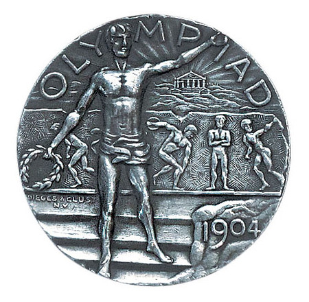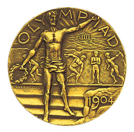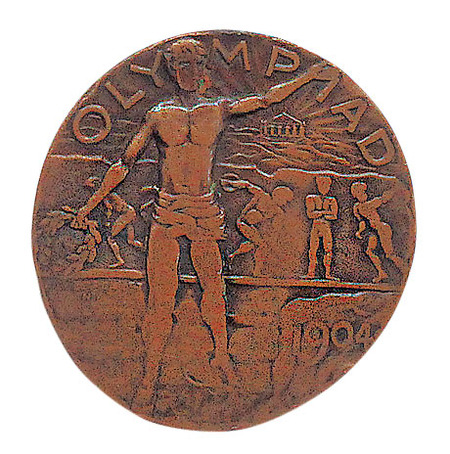 Аверс: победитель с поднятой в приветствии рукой и с оливковым венком. На заднем плане фигуры античных атлетов на фоне древнегреческого храма. Вверху по окружности английское слово OLYMPIAD; в правом нижнем углу имитация высеченной в камне даты: 1904.