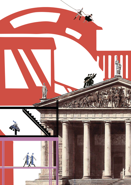 Идея графического фасада основывается на ассоциации декорации Экстер как строительные леса. Персонажи аванградистки оживают и начинают монтаж выставки. Таким образом, находясь снаружи, прохожие могут «заглянуть» внутрь Манежа. Фасад выполнен на баннерной сетке, следовательно создается эффект полупрозрачности и графика накладывается на архитектуру реального здания.