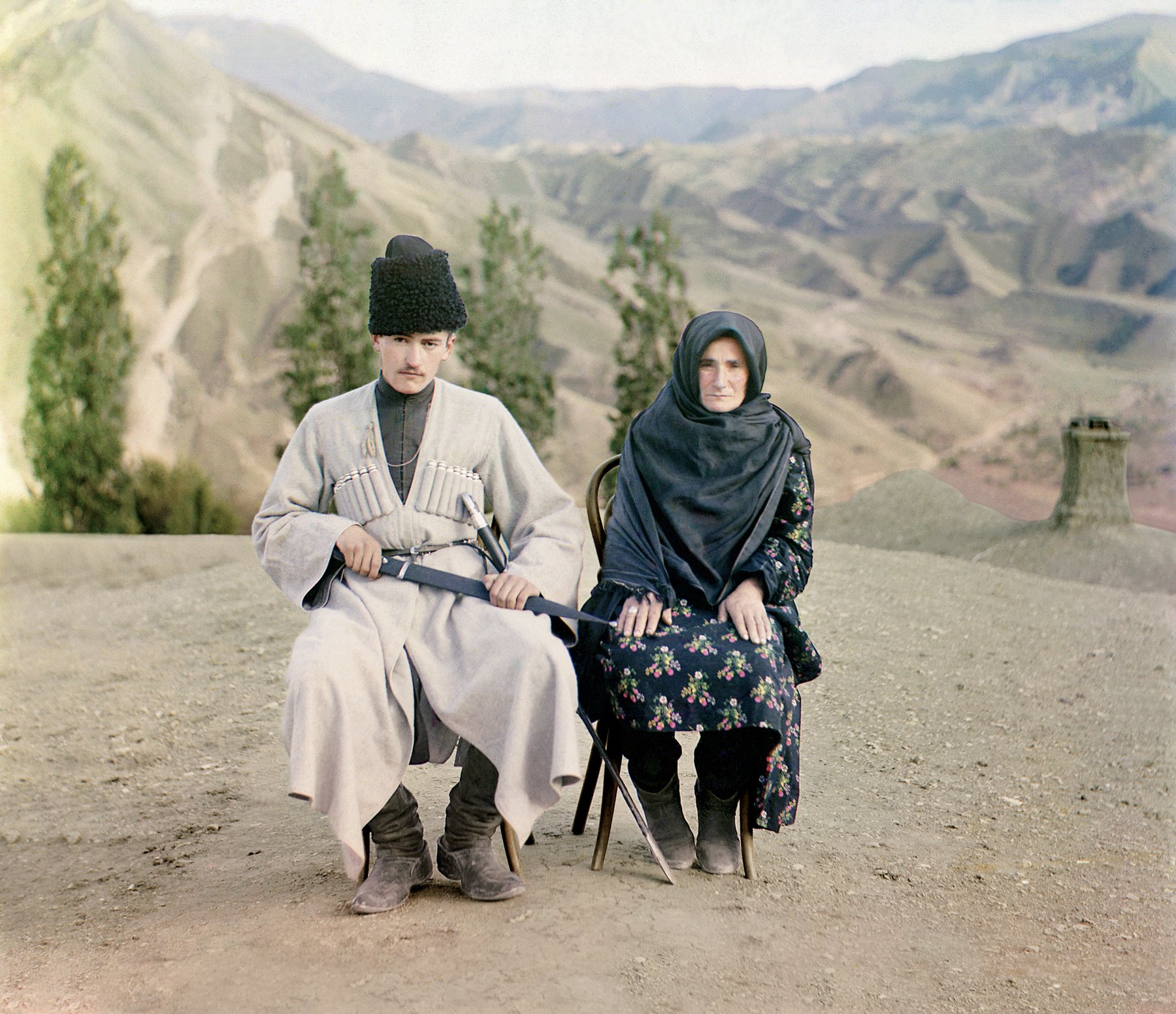 Мужчина и женщина — жители одного из дагестанских селений позируют на открытом горном пространстве. Снимок сделан в период 1904–1915 годов в одной из экспедиций Прокудина-Горского по Дагестану.