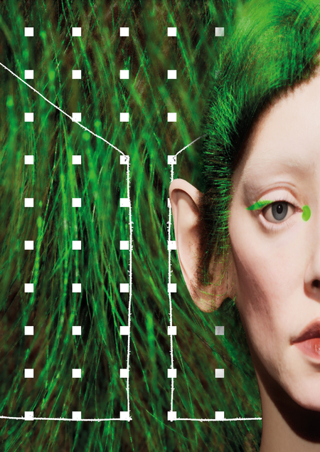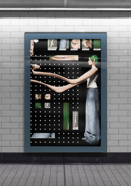 Типографические элементы обрамлены инвертированными прямоугольными плашками, что позволяет органично интегрировать текст в точечную сетку.