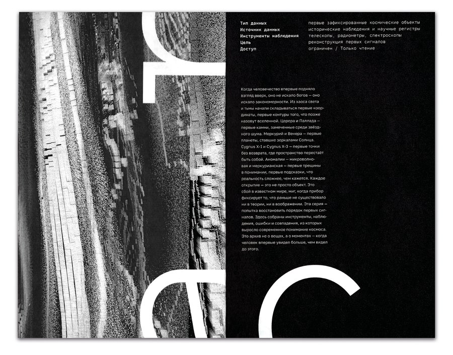 аrchive [01] — это проект-исследование о первой волне космических открытий: о том, как человек впервые увидел больше, чем позволяли глаза, и расширил границы знакомой Вселенной. В архиве собраны четыре направления — первые астероиды, первые планеты, первые чёрные дыры и первые космические аномалии.