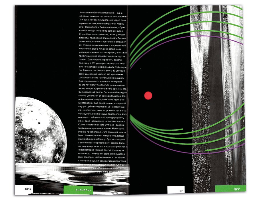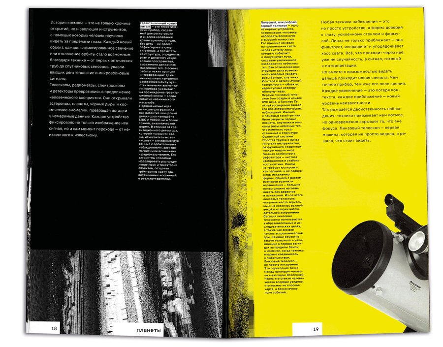 Каждый разворот посвящён одному объекту: его открытию, физическим характеристикам и роли в истории наблюдений. Параллельно раскрывается технический контекст — какие инструменты, методы и устройства сделали это обнаружение возможным.
