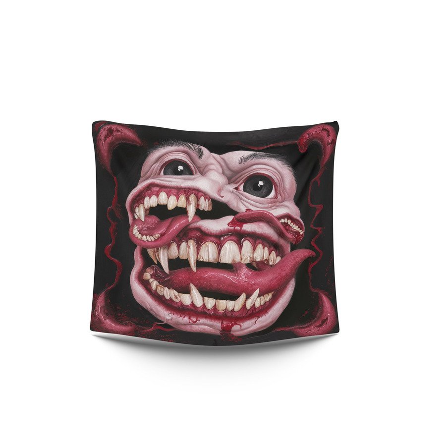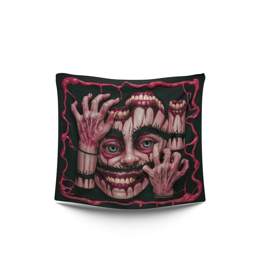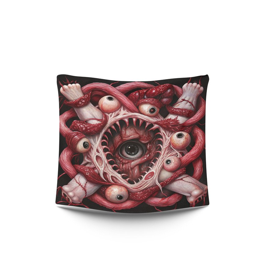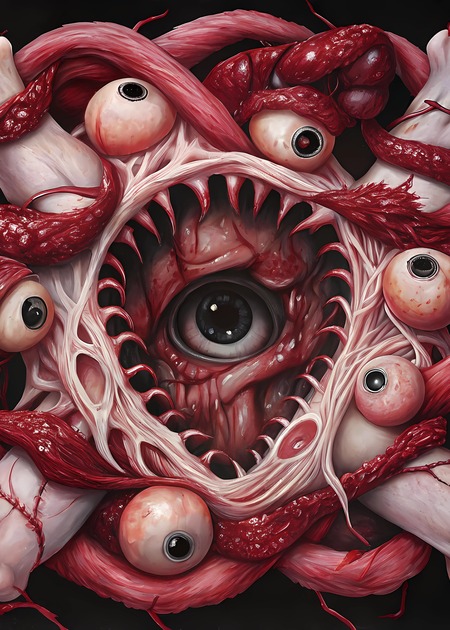 Ominous illustration in black and red colors. Intertwined severed body parts and eyes are depicted. The flesh of which is covered in places with black stitches. In the background there are bloody bruises forming a frame.