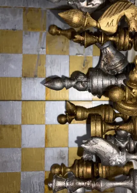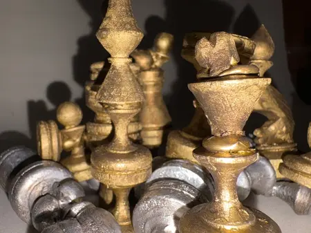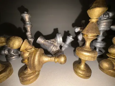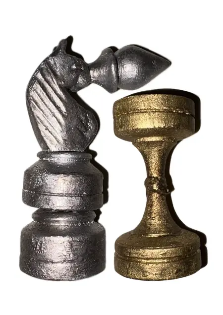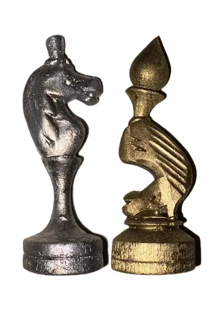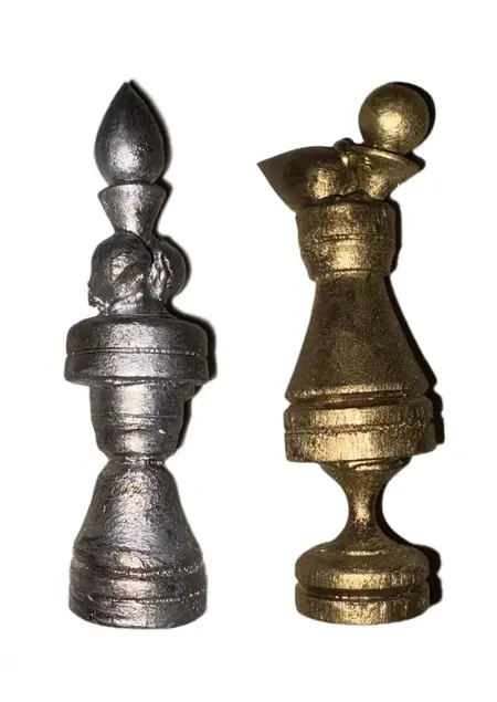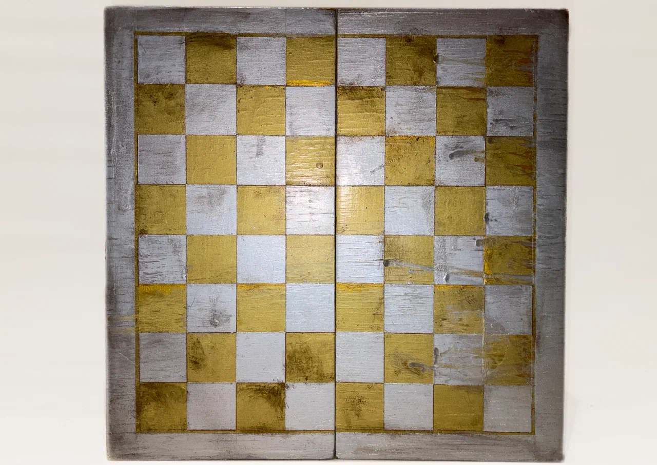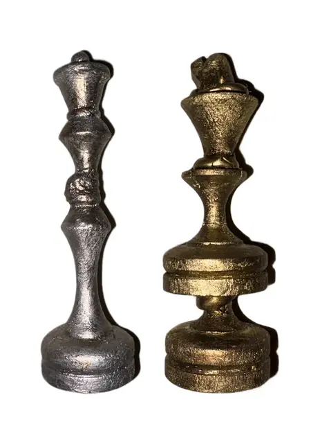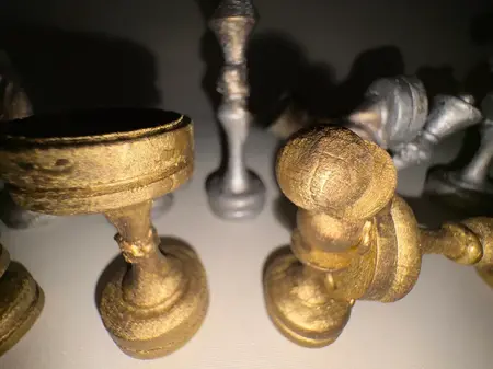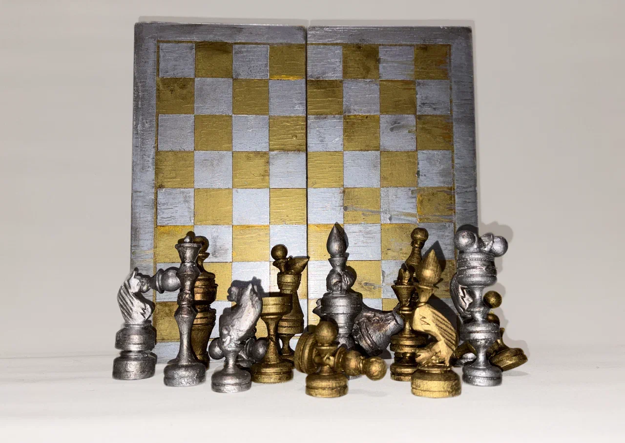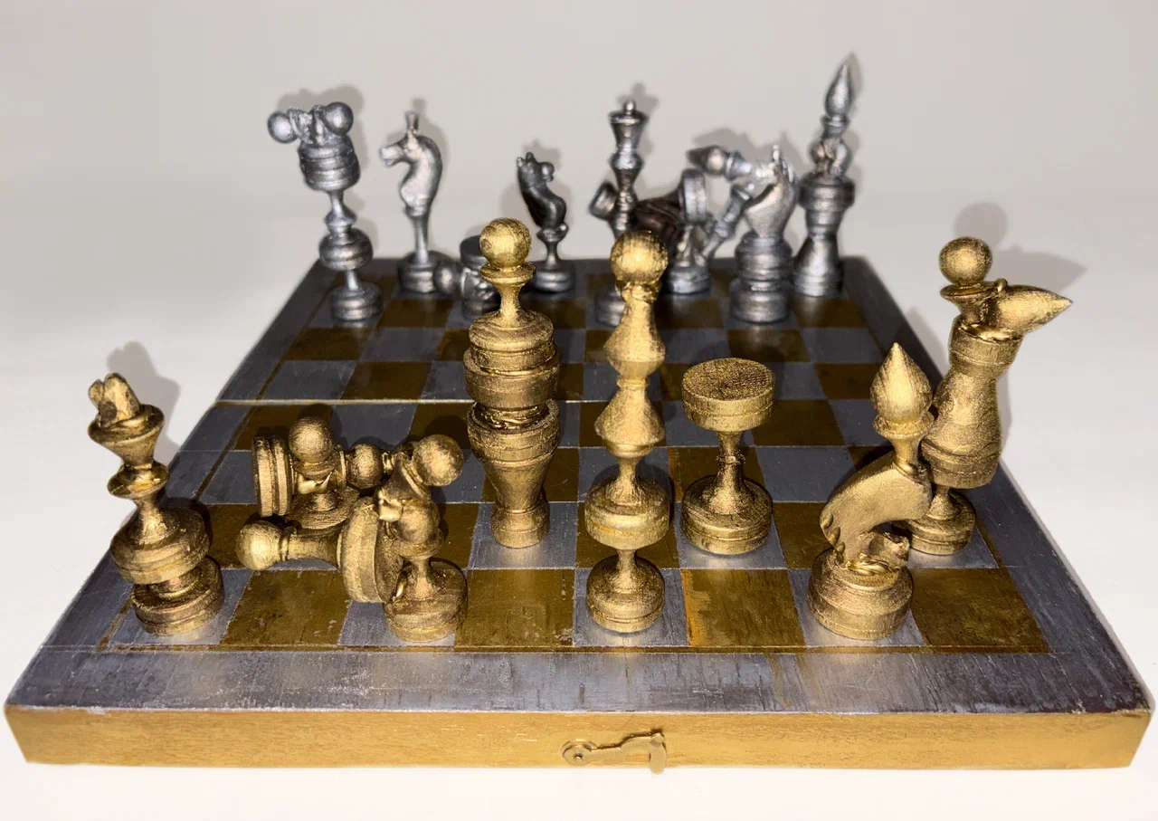 Материалы: шахматные фигуры, шахматная доска, горячий клей, акрил, лак