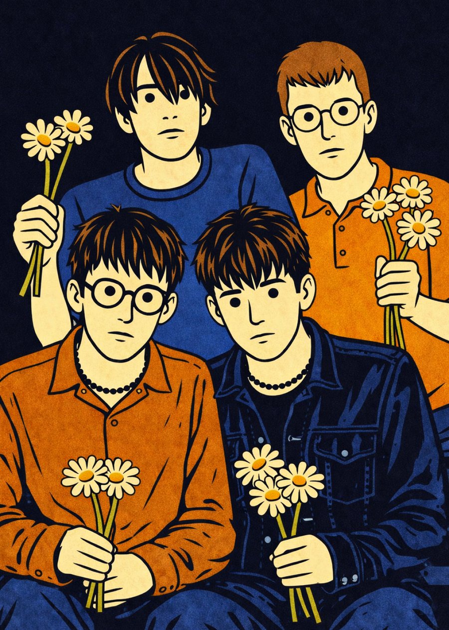 Последним этапом я сгенерировала обложку в Sora, совместив стиль обложки The Best of с понравившейся мне фотографией членов группы, попросив также нейросеть использовать мою основную палитру в итоговой иллюстрации.
