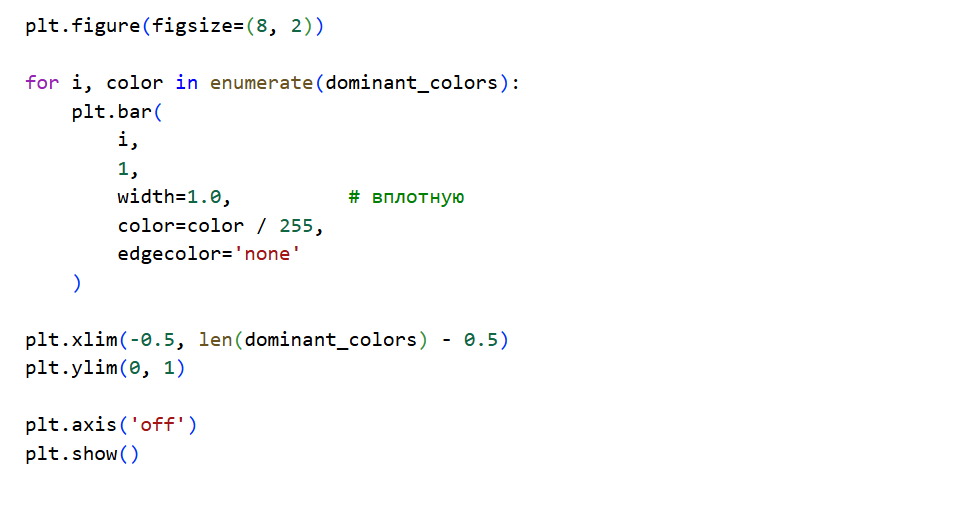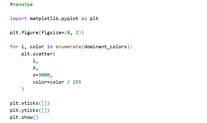 Для выявления наиболее часто встречающихся цветов была применена кластеризация методом KMeans. Количество кластеров соответствует числу доминирующих цветов палитры.