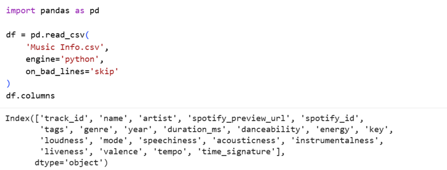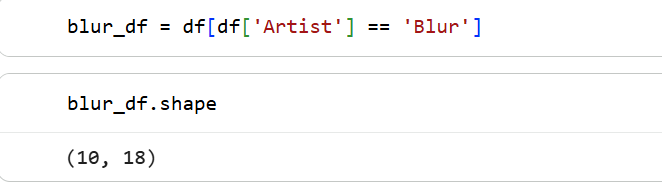 1. подключение библиотеки Pandas 2. загрузка музыкального датасета 3. проверка структуры таблицы 4. выделение треков Blur