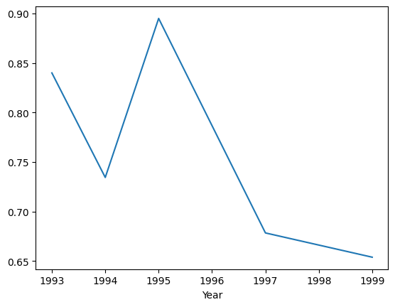 Что показывает: Изменение средней популярности треков Blur по годам.
