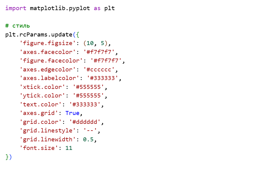 Я задала стиль графиков кодом, чтобы визуализация была частью исследования, а не постобработкой в редакторе. Это позволяет воспроизводить стиль автоматически и сохранять визуальную консистентность при работе с данными.