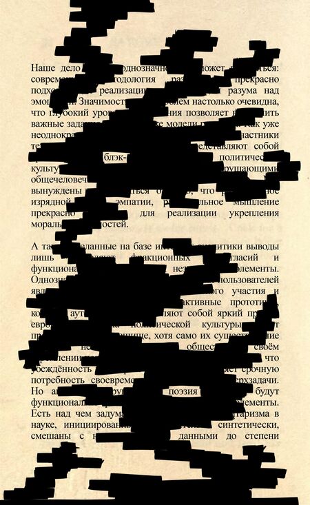 Блэкаут поэзия — это уникальная форма повествования, находящаяся на стыке поэзии и визуального искусства. Используя инструменты цензоров, она берёт существующие произведения и удаляя «лишнее» придаёт оригинальным словосочетаниям новые смыслы.