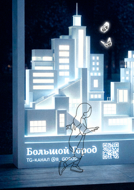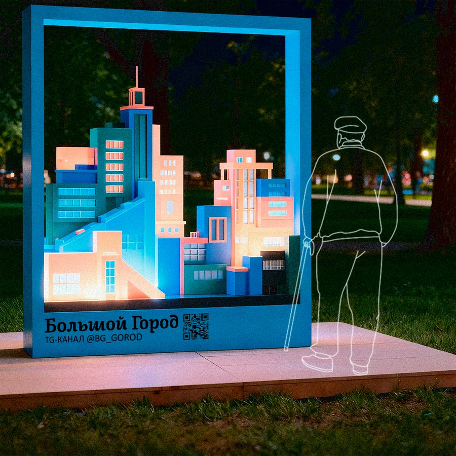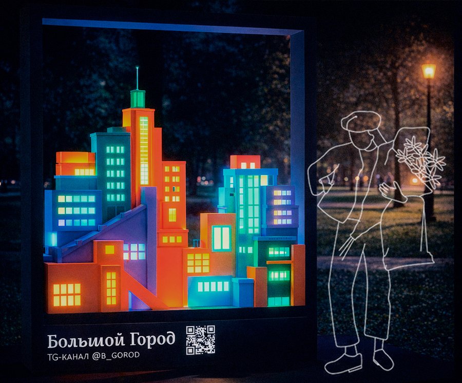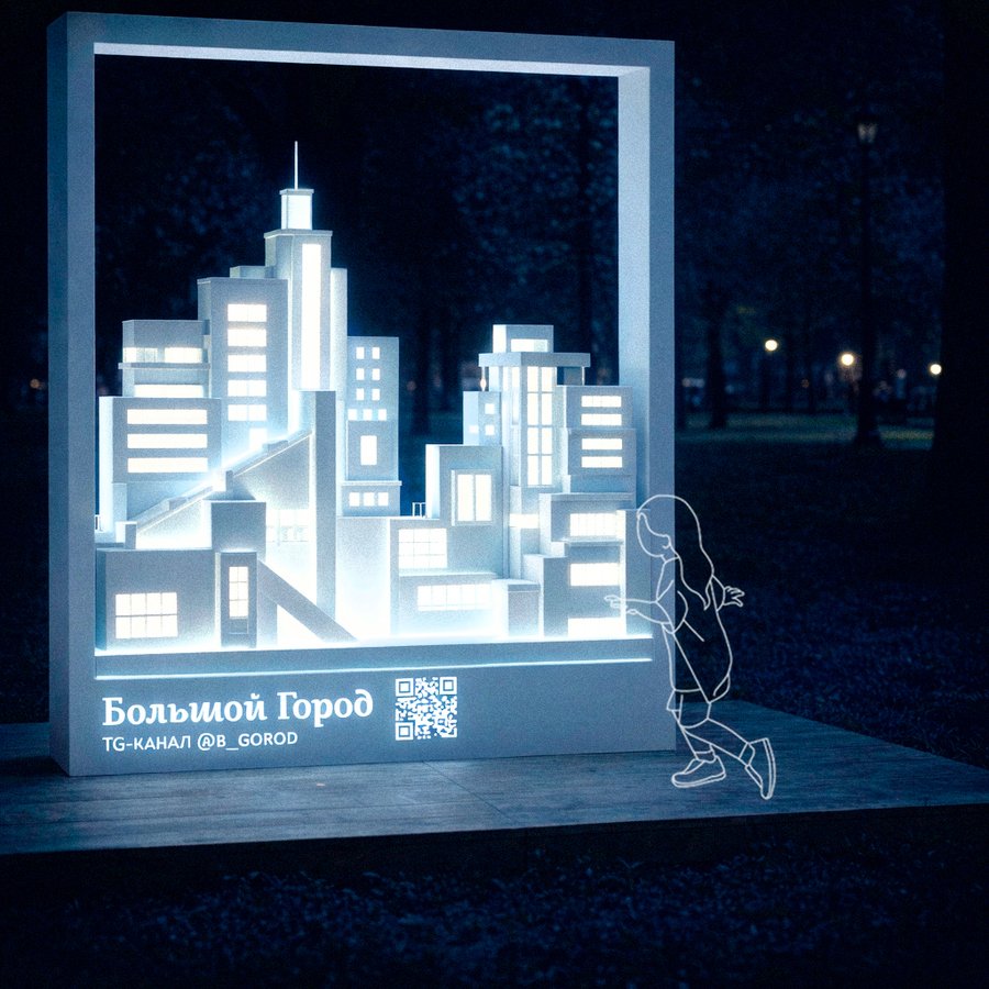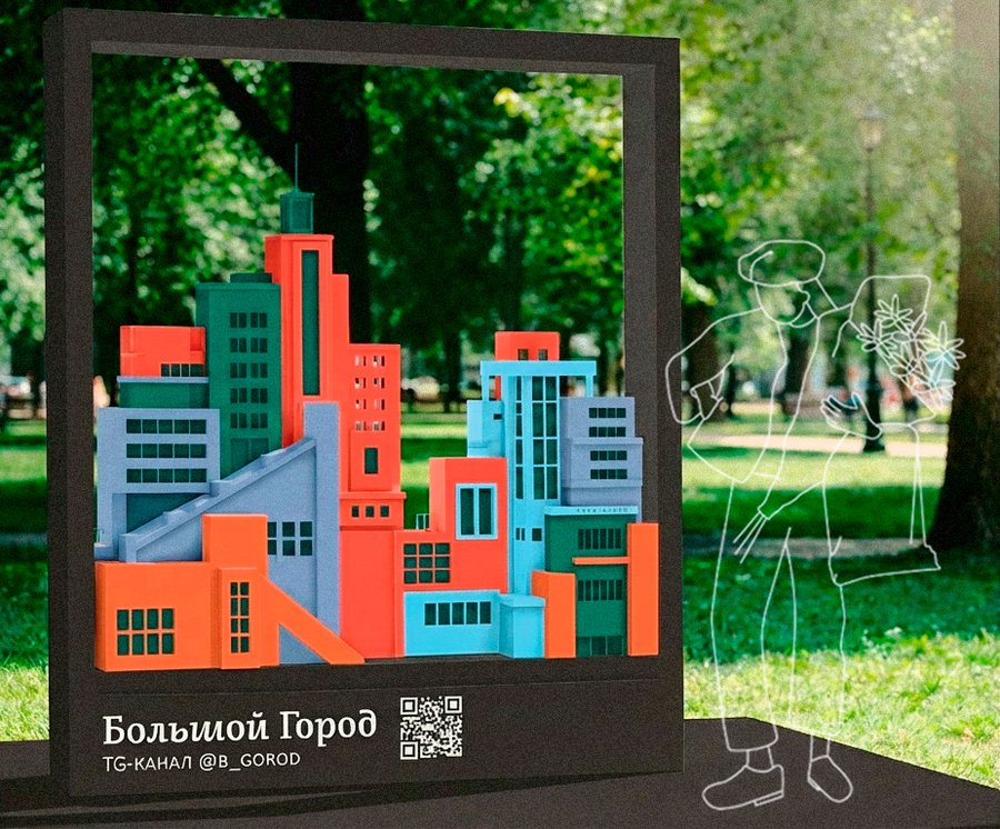 Техническое задание предусматривало разработку временной интерактивной инсталляции/фотозоны для медиа «Большой город», которое освещает культуру, технологии и повседневную жизнь современного мегаполиса.