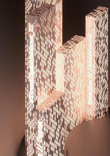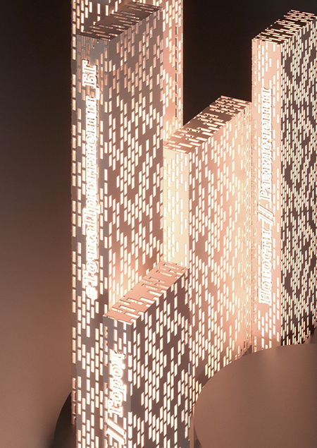 Свет: Внутри каждого модуля — линейные светодиоды оранжевого свечения. Ночью свет, проходя через перфорацию, создаёт эффект «горящих окон» в небоскрёбах.