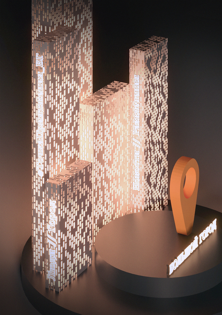 Инсталляция представляет собой публичный памятник городскому исследователю. Круглый подиум — это «место силы» горожанина, с которого открывается вид на его стилизованную вселенную. Пять светящихся лайтбоксов из перфорированного металла — это архитектурный дайджест мегаполиса, его ритм и многослойность. Оранжевая точка является визуальной навигацией.