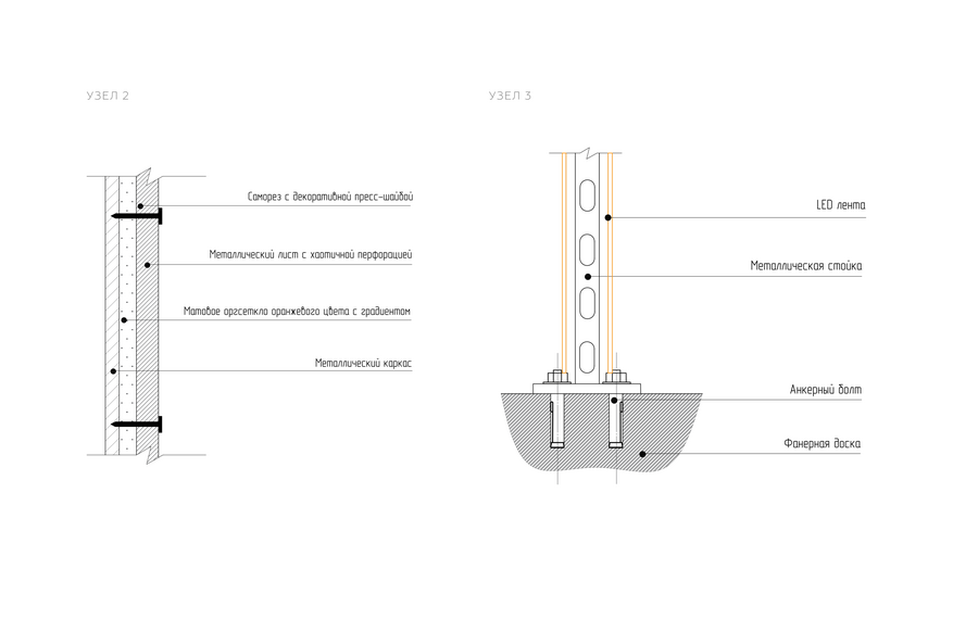 Узел 2 представляет собой послойное строение лайтбокса. Основными слоями являются декоративные — матовое оргстекло и металлические листы с хаотичной перфорацией. Узел 3 иллюстрирует подробное крепление металлической стойки к подиуму, который имеет основание из фанерной доски.