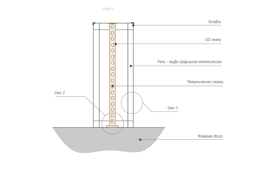 Узел 1 иллюстрирует рарзрез и внутреннее строение лайтбокса. Каркас Лайтбокса выполнен из металлической рамы и прикрепляется к подиуму кронштейном. На металлической стойке также расположена LED подсветка.