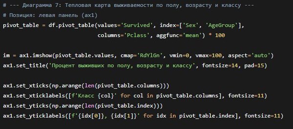 Анализ данных показывает, что на выживаемость пассажиров «Титаника» сильнее всего влияли пол и класс кают. Женщины и пассажиры первого класса имели наибольшие шансы на спасение, тогда как в третьем классе выживаемость была значительно ниже.