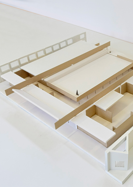 Макет изготовлен из переплетного картона и пенокартона и представляет собой архитектурно-дизайнерскую модель в масштабе 1 к 100, с размерами 56 на 47,2 см. Данный объект включает в себя входную группу выставки LE ART, посвященной творчеству выдающегося архитектора и художника XX века Ле Корбюзье.