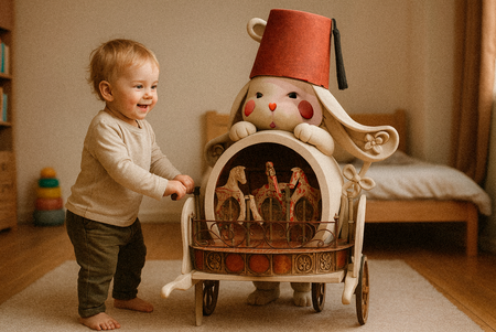 Вдохновением послужили исторические игрушки, с которыми играли дети Турции давнего времени. Главная идея заключается в том, чтобы поддержать первые шаги ребенка в возрасте 9-24 месяцев, развить равновесие, координацию и силу ног. Стимулятором внимания, позволяющим превращать занятия в игру являются подвис- ные фигурки, качающиеся из одной стороны в другую при движении.