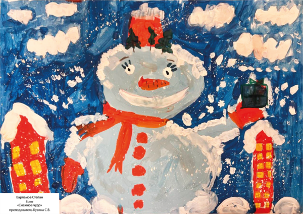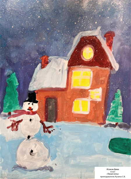 Цифровая выставка „Ожидание чуда“ объединяет живописные и графические работы детей и подростков. В этих произведениях новогодняя тема раскрывается через знакомые и любимые образы: снеговиков, животных, украшенные ёлки, светящиеся окна домов и сказочных персонажей. Каждый рисунок становится отдельной историей, в которой отражается радостное предвкушение праздника и вера в волшебство.