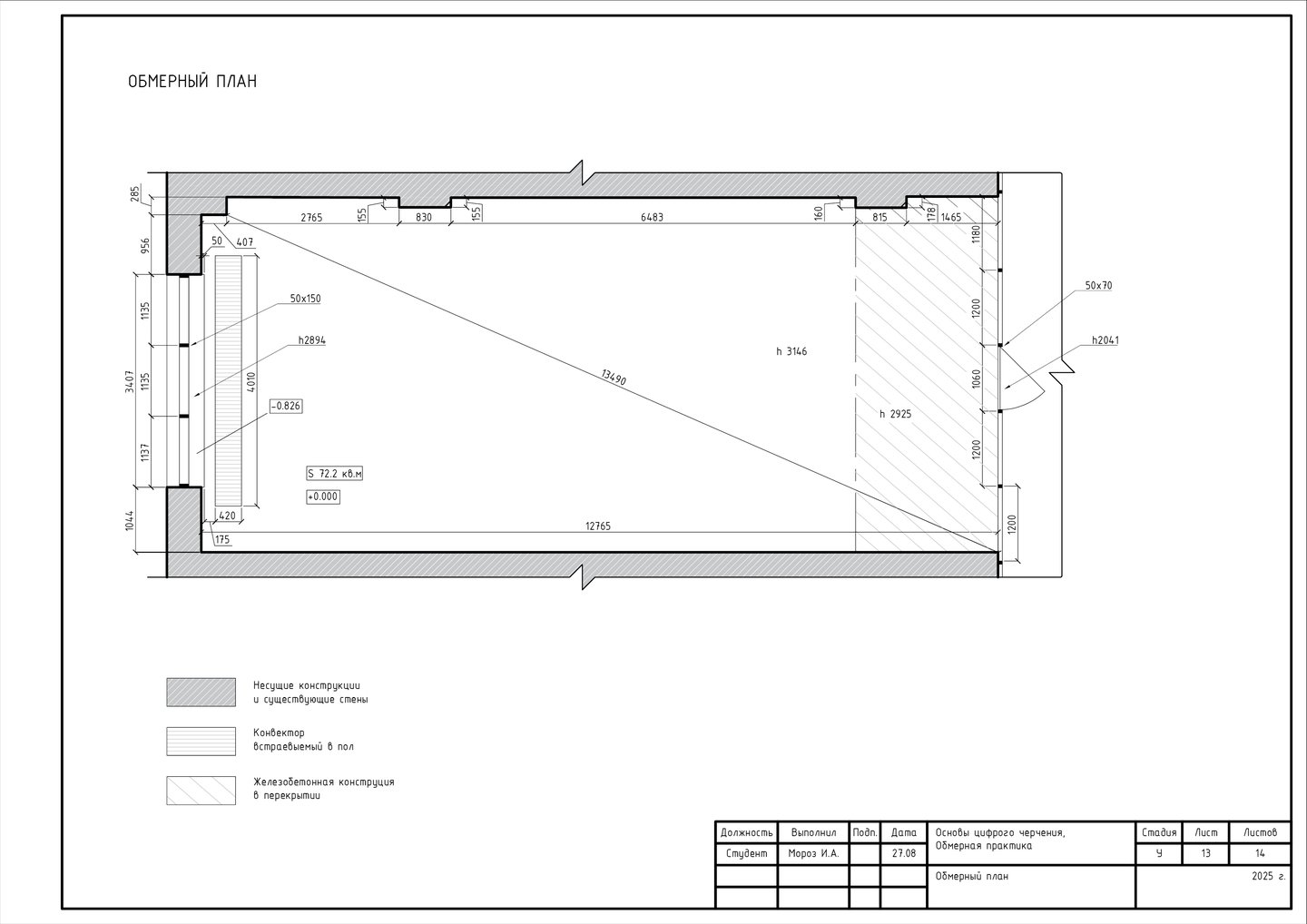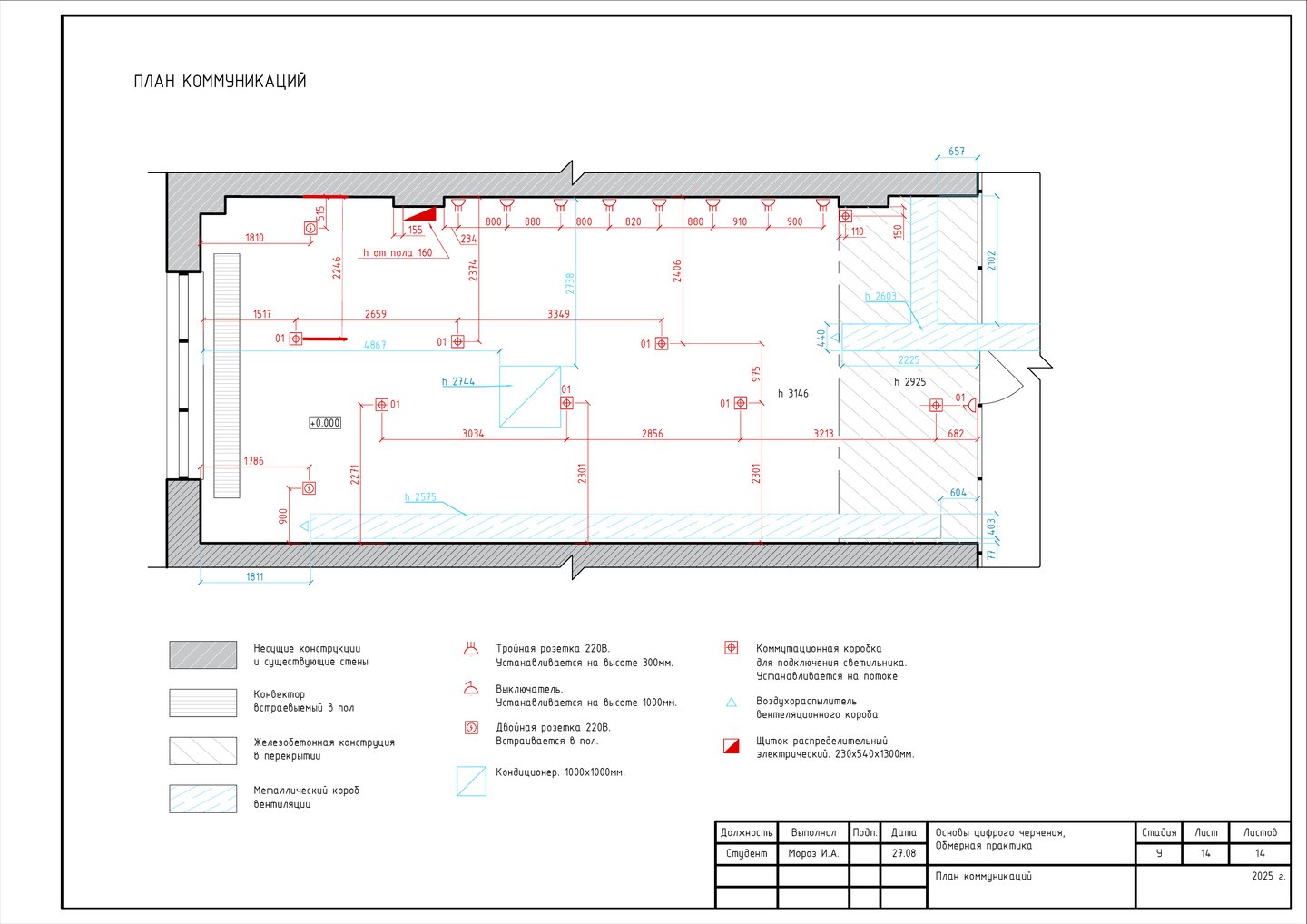 Итоговая работа — пакет документации дизайн-проекта учебного кластера: обмерный план помещения, схема инженерных систем и чертёж с проектным решением по размещению перегородок.