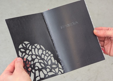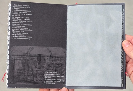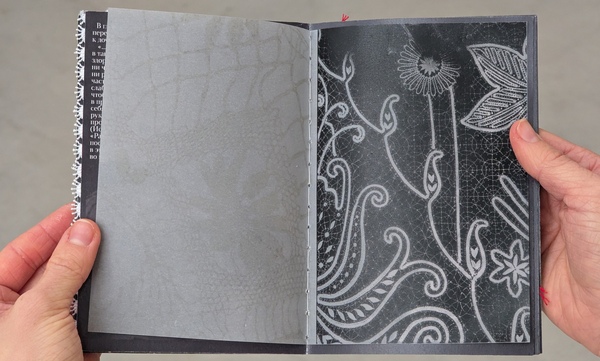 Большое внимание уделено работе над вином после печати: промерзание кружева на бумаге, имитация сколка, коллаж