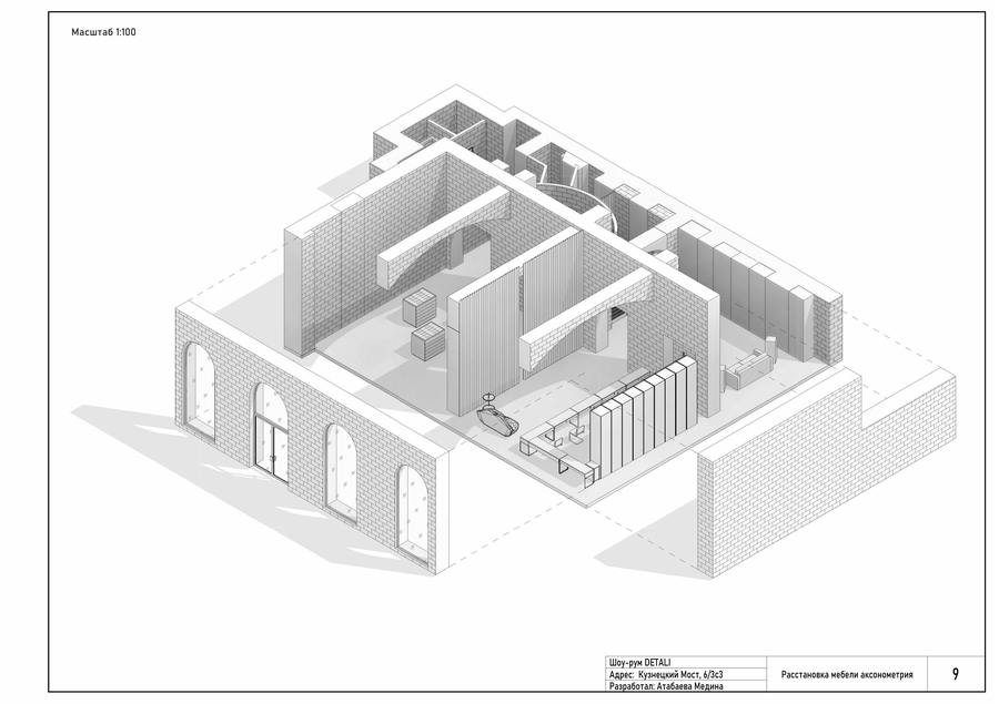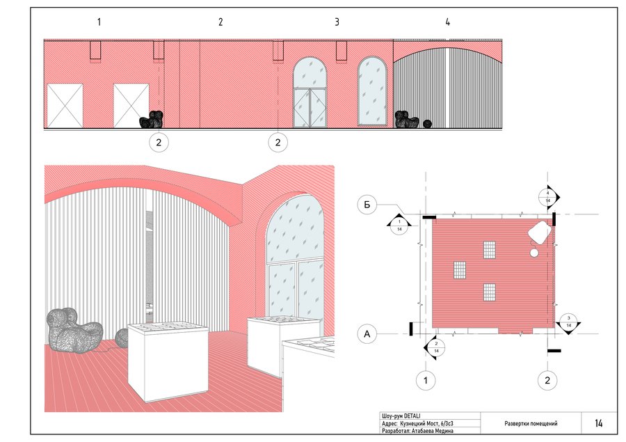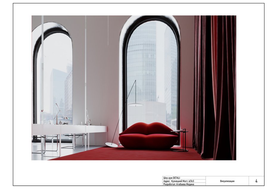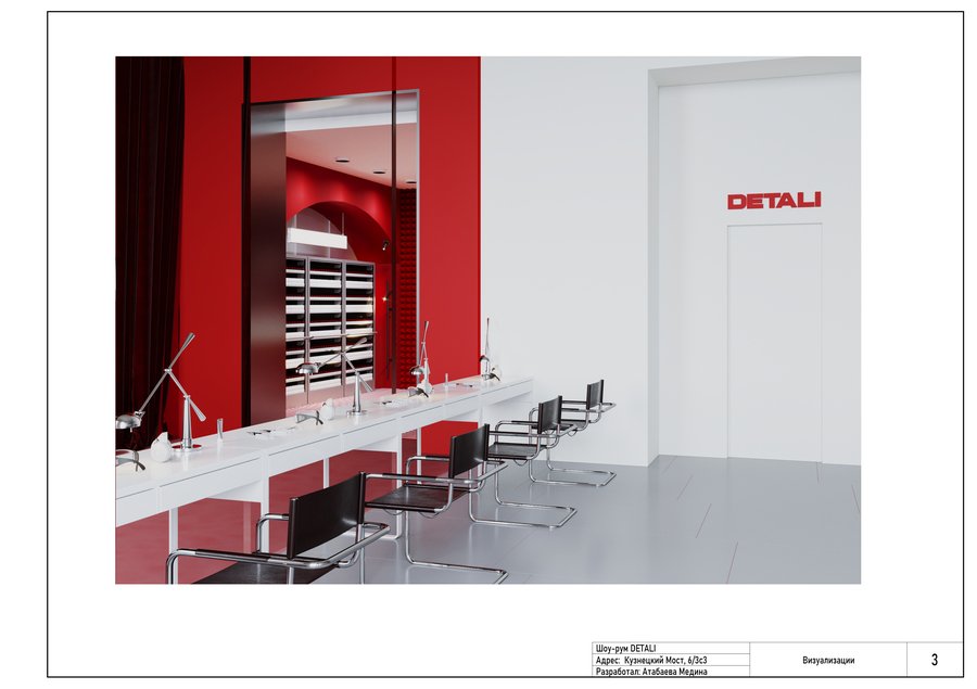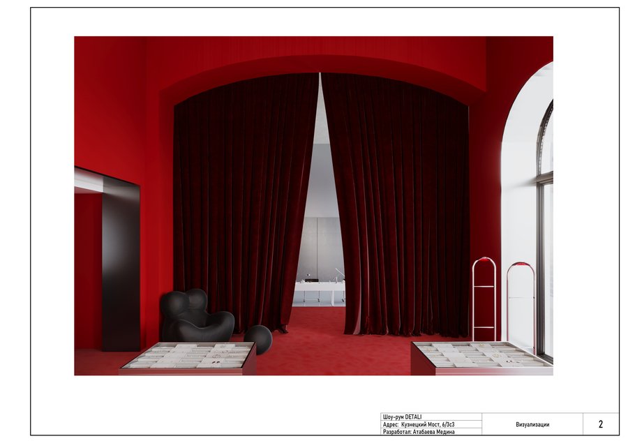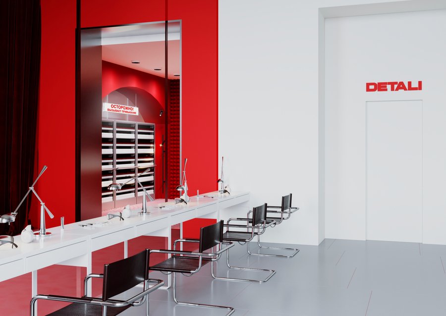 Шоу-рум DETALI — это сочетание лаконичности и сюрреалистичности. Симметрия, геометрия и чистые формы сталкиваются с дерзкими, почти театральными элементами, акцентами. Яркий цвет бренда задает ритм, чувство напряжения, огня. Минимализм же придает чувство строгости и даже остроты. Интерьер магазина передает атмосферу иронии, движения и игры. Шоу-рум не просто демонстрирует товар, он превращает украшения в эмоциональный опыт, работает на контент и яркие впечатления.