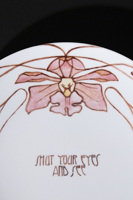 В рамках практики «Роспись по фарфору» была выполнена декоративная тарелка с растительным мотивом в стиле ар-нуво, для которого характерны модернистские формы, текучие линии и орнаментальная пластика. Изображённые на тарелке орхидеи символизируют чувственное познание и эстетическое совершенство. Визуальным источником вдохновения послужила графика журнала Jugend, а в качестве текстового элемента была выбрана цитата Джеймса Джойса «shut your eyes and see» («закрой глаза и смотри»), интерпретируемая как метафора поиска новых, нестандартных и интуитивных способов восприятия реальности. Работа выполнена в технике надглазурной росписи по фарфору и обожжена при температуре 780 °C.
